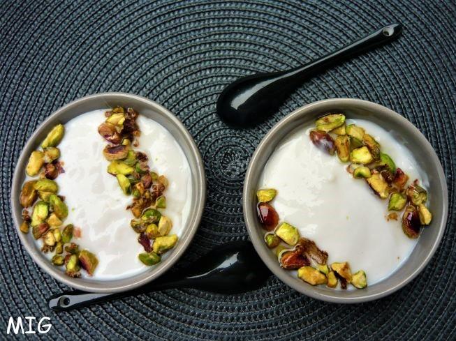Sortir le plat du réfrigérateur, fouetter la préparation pour la rendre onctueuse, la répartir dans des coupelles, mettre les pistaches/pignons caramélisés dessus, faire tomber quelques gouttes d’eau de rose.