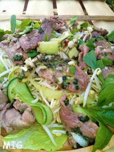 Pour ceux qui connaissent la cuisine thaïlandaise, même si le goût est totalement différent, on retrouve l’esprit du « Tigre qui pleure » ou « Larmes du Tigre » (Seua Rong Haï) puisque dans les deux cas il s’agit de lamelles de boeuf marinées, grillées, et servies avec des herbes fraîches. Pour cette dernière recette, viennent s’ajouter des crudités.
