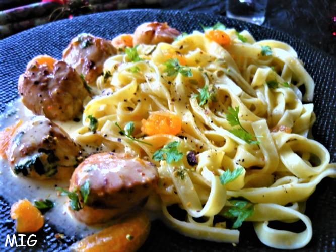 S’agissant d’une préparation minute, comme vous ne voulez pas planter vos invités pendant le repas, préparez la sauce avant, il vous suffira juste de la réchauffer au bain-marie pendant que vous poêlerez les Saint-Jacques et cuirez les tagliatelles (ce qui fait 3 à 4 mn pour les premières, selon la taille, et environ 2 pour les secondes), préparez également les suprêmes de clémentines et les pistaches.