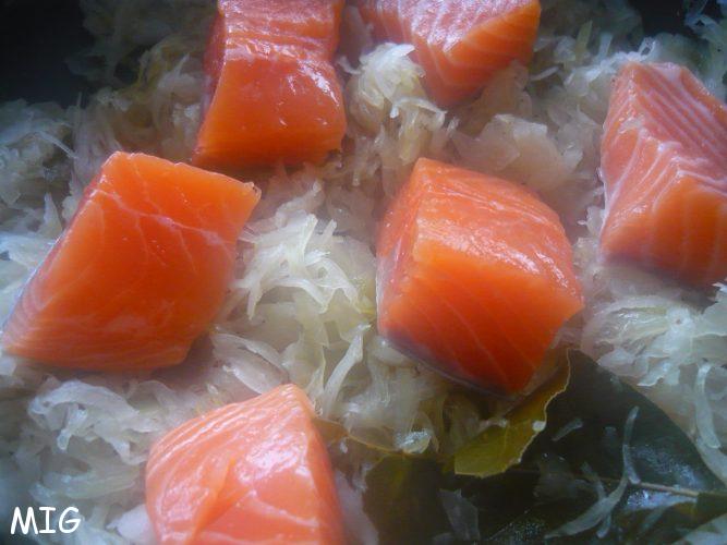 Pendant ce temps, à la surface de la choucroute qui mijote doucement, posez les pavés de saumon et de cabillaud, préalablement coupés en deux (on compte un demi pavé de chaque par personne) couvrez, sans mélanger.