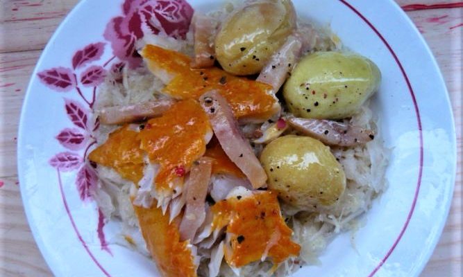 Cette recette m’avait été donnée par un poissonnier, avec sa petite astuce perso : parsemer la choucroute de fines allumettes de hareng fumé, qui font un petit condiment original et très agréable.