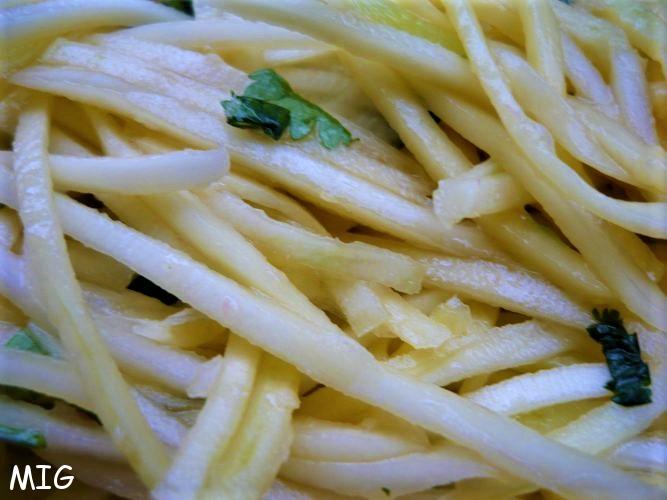 Dans le même esprit que sa cousine la Salade de Papaye Verte mais très différente, tant pas le goût du fruit que par celui des ingrédients de la sauce, elle va aussi vous réveiller les papilles.