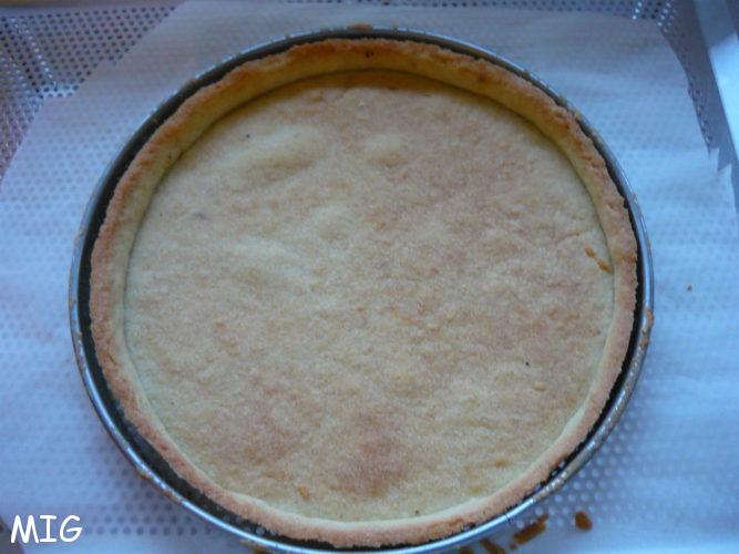 Sur un plan de travail fariné (un peu, si on met trop de farine elle s’incorpore à la pâte et ça change toute sa recette en commençant par la rendre friable), étalez la pâte sur une épaisseur d’environ 5 mm d’épaisseur puis foncez le cercle beurré (lui même posé sur une plaque à pâtisserie, si, comme la mienne, elle est perforée, mettre un papier cuisson) en marquant bien l’angle à la base – on fait descendre doucement la pâte puis on appuie (j’utilise un pinceau à pâtisserie pour cela, ça ne perce pas la pâte).