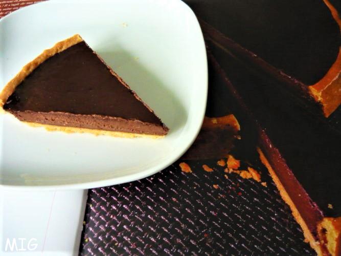 Garnissez-en la pâte jusqu’à 5 mm du bord (je fais cela lorsque la pâte est tiède et non brûlante, ça évite que la ganache qui va entrer immédiatement en contact avec la pâte commence à cuire).