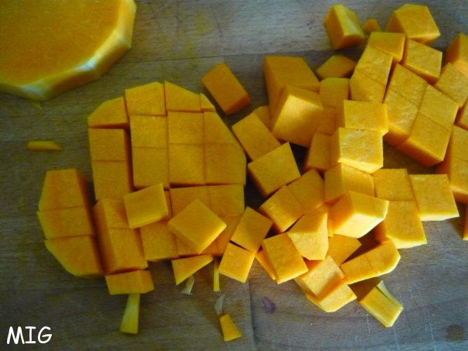 Dans l’huile d’olive chaude, faite revenir les dés de butternut, en remuant régulièrement, jusqu’à ce qu’ils soient bien dorés sur toutes leurs faces, et fondants.