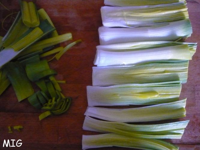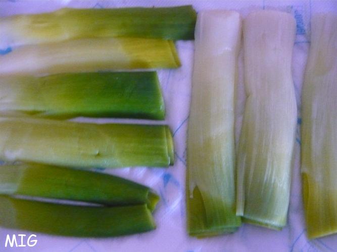 Epluchez les poireaux, coupez la partie vert foncée en faisant des tronçons de longueurs identiques (ne le jetez pas ce serait dommage, si vous n’en avez pas l’utilité, congelez-la après l’avoir lavée, séchée, émincée, vous pourrez la mettre dans une soupe, faire une fondue de poireau etc…), puis coupez-le en deux dans le sens de la longueur et lavez-les bien.
