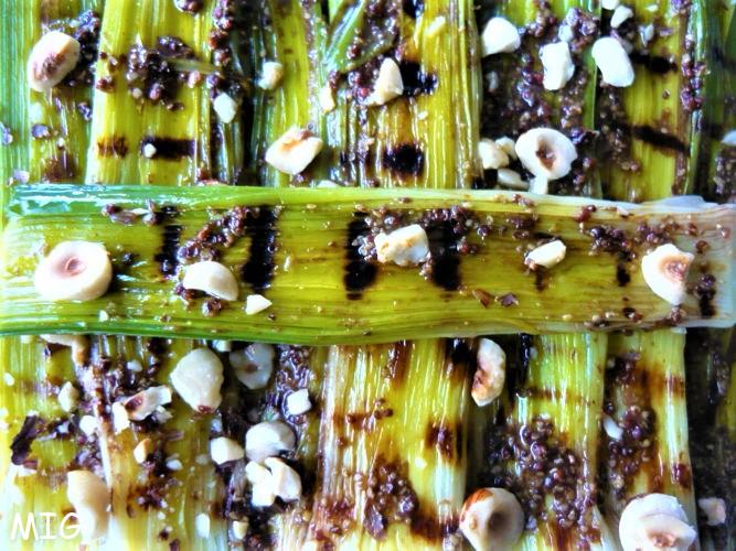 Dans un bol mélangez la moutarde, le vinaigre, l’huile d’olive et nappez les poireaux, parsemez de noisettes concassées, consommez tiède ou à température ambiante mais surtout pas froid ou glacé.