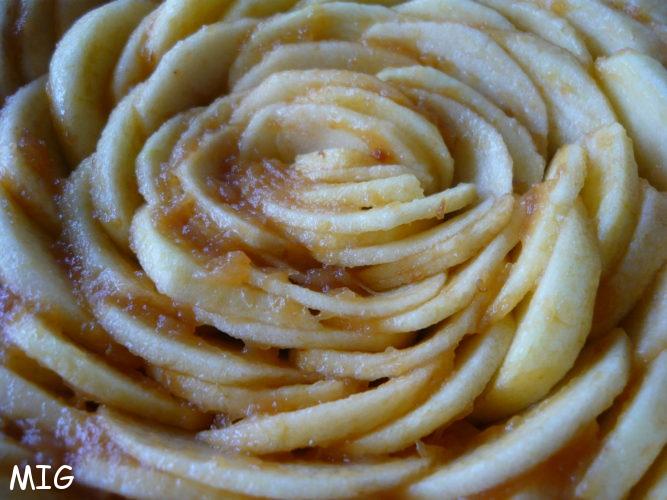 Garnir ensuite avec les lamelles de pommes, en les positionnant verticalement, la partie la plus fine au fond puis,  à l’aide d’un pinceau, badigeonnez la surface de la tarte avec un peu de compote de pommes diluée dans une cuillère à soupe d’eau ou, mieux, avec le sirop qui remonte en surface de la compote quand elle a reposé.