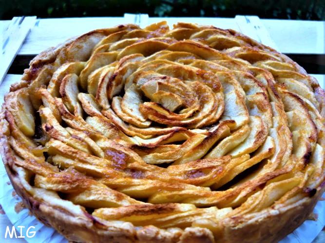 Une bonne pâte feuilletée pur beurre (qui chante quand on déplace la tarte, j’adore), de la compotée de pommes sans sucre, des pommes sucrées naturellement et personne ne devinera qu’il n’y a pas un gramme de sucre ajouté ou autre substitut.