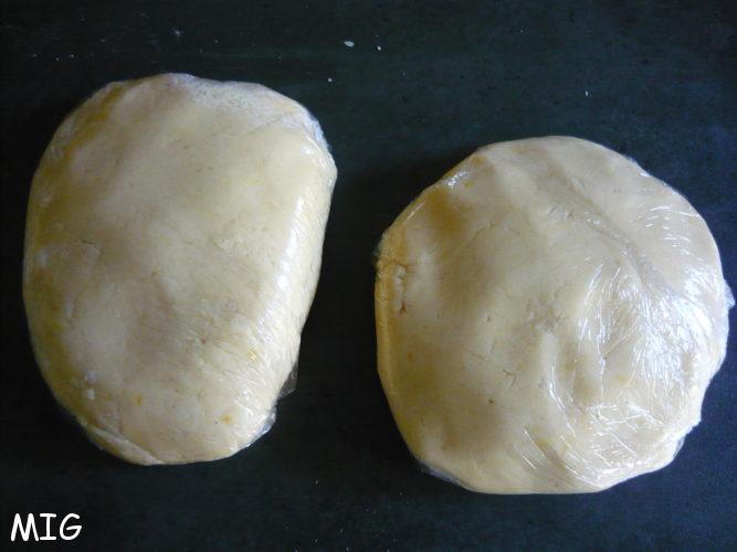 Pâte sucrée (j’ai laissé, et fait, la quantité pour les deux tartes, tout simplement parce qu’elle se congèle très bien, j’ai donc divisé la quantité obtenue par deux et congelé un des deux pâtons filmés) :
