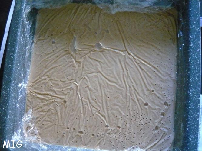 Vous faites exactement comme précédemment, sauf qu’il y a un peu plus d’eau et il y aura donc un peu plus de caramel et, bien entendu, vous ne mixez pas, vous vous contentez de briser (une fois froid bien évidemment), avec les mains et d’écraser un peu avec le rouleau à pâtisserie pour avoir, à la fois, des fruits entiers et des brisures.