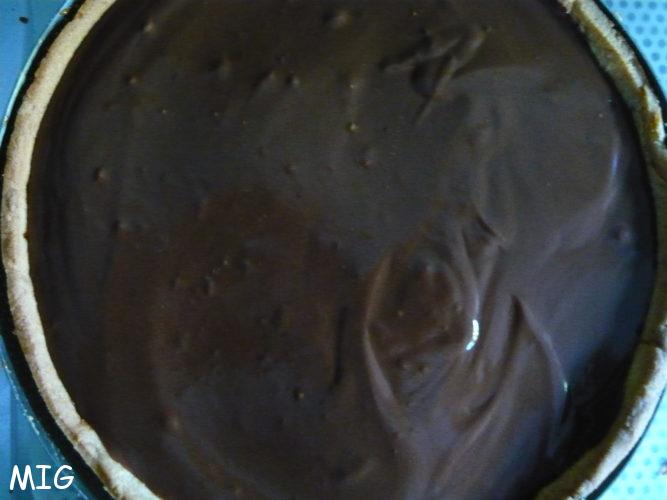 Une fois que le praliné est « pris », coulez dessus environ 5 mm de ganache au chocolat, laissez prendre au frigo.
