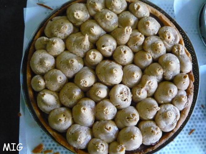 Ensuite, sur le chocolat « pris », pochez des boules de ganache montée pralinée de différentes tailles sur la presque intégralité de la tarte puisque vous devrez vous arrêter à 2 cm des bords (elle est tellement bonne je me suis laissée emporter par mon élan, jusqu’aux bords, pas eu de plaintes, bizarre non ?).