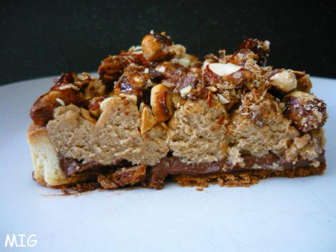 A bien y regarder, elle est finalement assez légère cette tarte, les ganaches étant uniquement composées de chocolat, praliné, crème fleurette (il est préconisé à 35 % dans la recette, j’ai pris celle que j’avais à la maison qui est à 30 %), oeufs, sucre et très peu de beurre dans la ganache au chocolat.