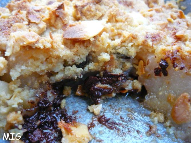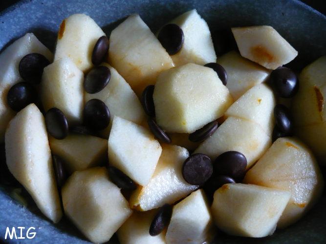Epluchez et coupez les poires en quatre, positionnez-les dans le plat en évitant les espaces et répartissez le chocolat en évitant qu’il soit posé sur le fond du plat, recouvrez de l’appareil à crumble, enfournez pour environ 40 mn et baissez le four à 180°.