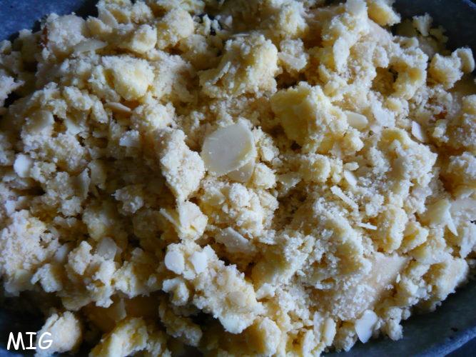 Mélangez la farine, le sucre, le sel, les amandes puis ajoutez les dés de beurre et sablez la pâte en appuyant sur le beurre en même temps que vous le mélangez au reste.