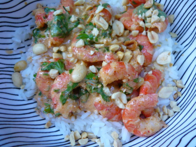 Quand le riz est prêt, répartissez-le dans des assiettes creuses ou des bols, ajoutez les crevettes dans leur sauce, arrosez d’un filet de citron vert, parsemez des cacahuètes concassées et de la coriandre ciselée.