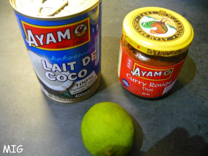 D’accord, j’avais, à part les crevettes, tout ce qu’il fallait dans mes placards puisque le lait de coco et la pâte de curry rouge y sont en permanence. J’ai utilisé des crevettes cuites mais si vous en avez des crues ou surgelées, adaptez le temps de cuisson. Ca marche aussi avec un reste de poulet coupé en petits morceaux ou un poisson blanc comme le cabillaud.