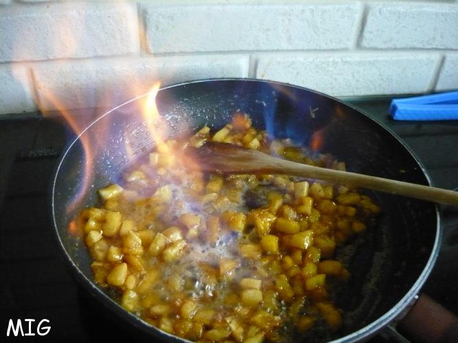 Epluchez et coupez en petits dés, le ou les ananas. Réservez-en un tiers (des dés pas un tiers d’ananas) à part et, dans une poêle chaude, faites confire les deux autres tiers, à feu moyen une dizaine de minutes dans le beurre, le sucre, et les graines de la gousse de vanille, puis, arrosez les du rhum et flambez le tout (on pense à arrêter la hotte quand on flambe). Quand il n’y a plus de flamme, mélangez et stoppez la cuisson.