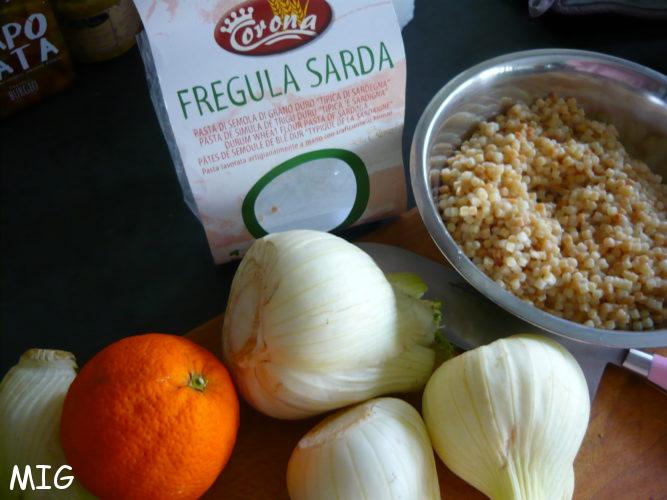 Emincez finement le fenouil et l’oignon rouge et versez-les dans la sauce ; mélangez bien et laissez macérer une dizaine de minutes avant de terminer avec la fregula sarda, les suprêmes d’agrumes, le basilic (ou autre, je n’en avais pas, j’ai mis de la coriandre) ciselé. Mélangez à nouveau, saupoudrez de piment d’Espelette.