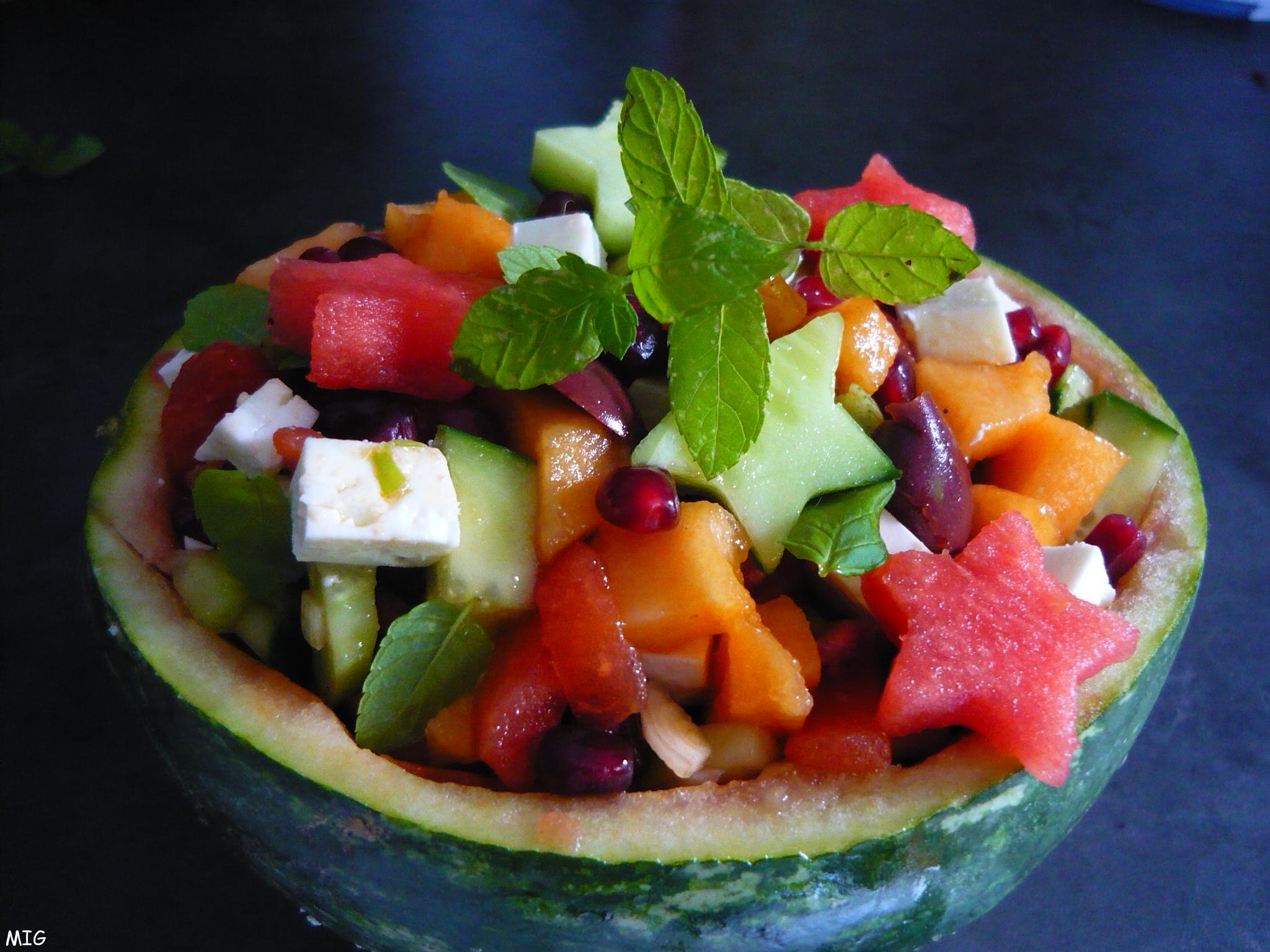 Coupez la pastèque, le melon, le concombre en petits morceaux de taille à peu près identique, versez les dans le saladier avec les grains de grenade, les olives, la menthe ciselée. Mélangez le tout, avant d’incorporer délicatement la feta coupée en dés, qui ne doivent pas trop s’écraser. Goutez et rectifiez l’assaisonnement si besoin.