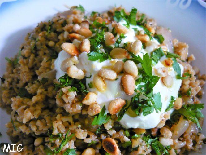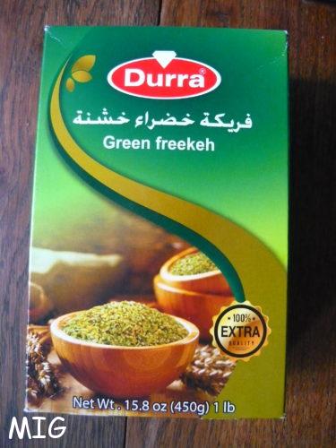 Normalement, cette recette est réalisée avec du freekeh (variété de blé dur, cueilli avant maturité, faible en gluten, appelé « blé vert ») mais le chef indique « ou boulghour » et comme je n’avais pas trouvé de freekeh au moment de la réalisation de la recette, j’ai boulghourisé. Depuis j’en ai trouvé, qui vient de Jordanie, dans une épicerie près du métro Barbès (une caverne d’Ali Baba, j’y ai aussi trouvé des pistaches d’Iran, de la farine de pistaches d’Iran et plein d’autres choses, bref, je m’égare) :
