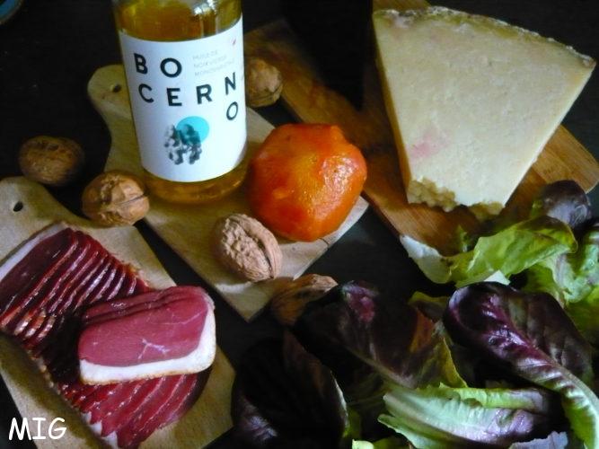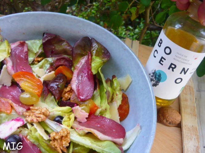 Une petite salade gourmande, ça faisait longtemps mais, en faisant l’inventaire du frigo pour savoir comment mettre en valeur la magnifique huile de noix offerte par BOCERNO (visible sur la recette), j’ai joué la carte Sud-Ouest, donc le magret de canard séché, le Cantal, les noix étaient un accord logique, betterave douce et raisin ont suivi.