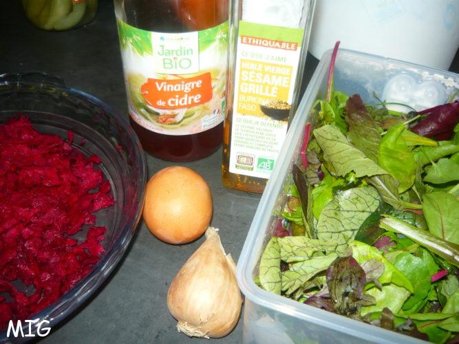 Mélangez dans un bol : la salade épluchée, lavée et bien essorée, la betterave épluchée et râpée (j’ai utilisé le bloc 4 faces Microplane), les cacahuètes concassées, puis la vinaigrette faite avec le sel, le poivre, le vinaigre et l’huile. Goutez et rectifiez si besoin.