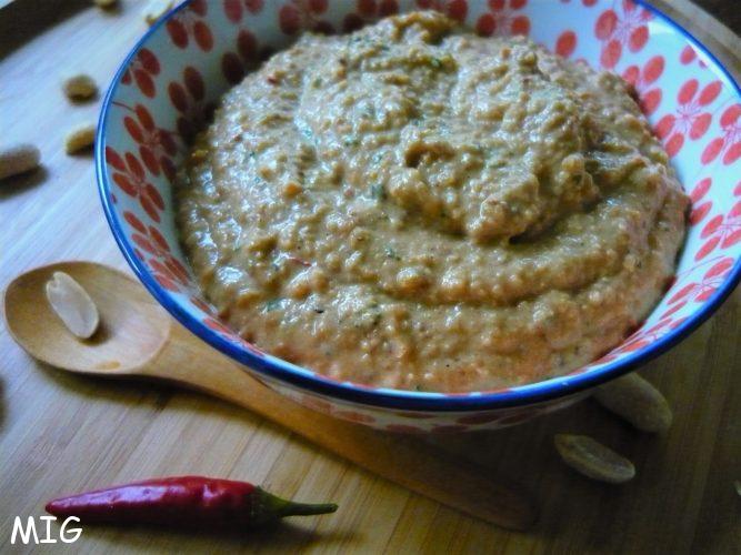 Traditionnellement, elle est faite dans un mortier avec des cacahuètes grillées non salées, mais si vous utilisez, comme moi, un petit robot, ça fera tout aussi bien l’affaire et, si vous êtes vraiment épuisé(e), vous pouvez utiliser du beurre de cacahuètes mais dans ce cas, prenez-en un, pas ou peu salé et avec des morceaux de cacahuètes, comme celui-ci :