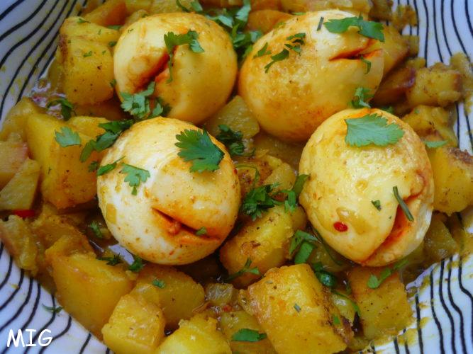 Retirez les pommes de terre de la poêle avec une écumoire et réservez-les. A leur place, donc dans la poêle et l’huile, faite cuire les oeufs environ 2 mn en les tournant délicatement. Réservez-les aussi puis faites dorer, toujours dans la même poêle, les oignons pendant 4/5 minutes. Ajoutez le gingembre, le piment, prolongez la cuisson d’une minute, puis saupoudrez avec le garam masala, le cumin et continuez encore une minute.