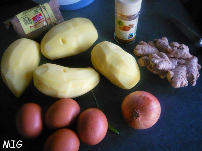 De son vrai nom « Aloo Dimer Jhol », cette spécialité de l’est de l’Inde est traditionnellement servie au petit déjeuner, accompagnée de riz basmati nature. Je l’ai servi au déjeuner, avec une petite salade verte, et c’était vraiment parfait. Simplement, ne l’ayant pas accompagnée de riz, j’ai doublé la quantité de pommes de terre et donc, celles de l’oignon, de l’eau, du gingembre, du garam masala et du cumin. La liste, ci-dessous, prend ça en compte.