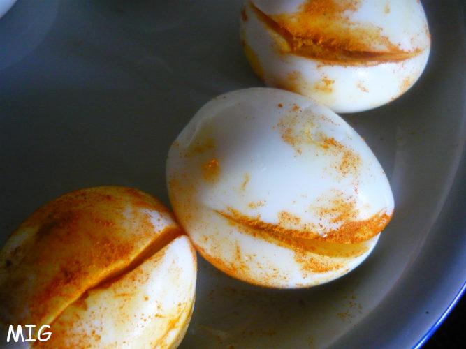 Pendant ce temps, fendez les oeufs et insérez délicatement le curcuma dans les entailles.