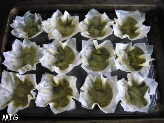 A l’aide d’un pinceau, beurrez les moules, les feuilles de pâte filo sur la face qui est vers vous (les autres faces toucheront moules/faces beurrés). Coupez les feuilles, aux ciseaux, de telle sorte que ça dépasse un peu des moules (si vous utilisez des empreintes à bûches, coupez-les pile aux dimensions des empreintes, pour faire des petites gouttières régulières et superposez bien les feuilles). Garnissez les moules, ronds, comme sur la photo, avec 3 épaisseurs de feuilles, sans superposer les angles de la seconde feuille à ceux des deux autres :
