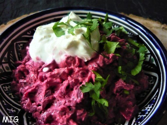 Epluchez les betteraves et râpez-les en julienne. Mélangez-les avec le yaourt puis assaisonnez avec le sel, le poivre, la girofle.