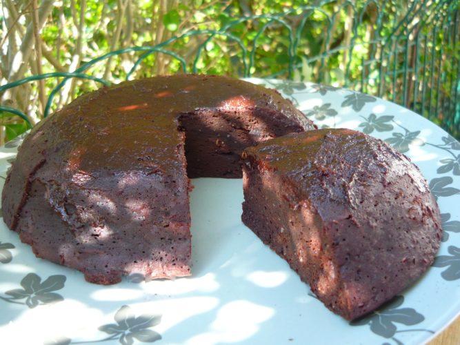 Je donne le temps de cuisson pour un résultat dense, moelleux, avec une partie mi-cuite au-dessus. A vous d’adapter, selon votre goût à + ou – 30 secondes. Si vous ajoutez de la poudre d’amande, de noisette, ou de noix de coco, il sera encore plus dense.