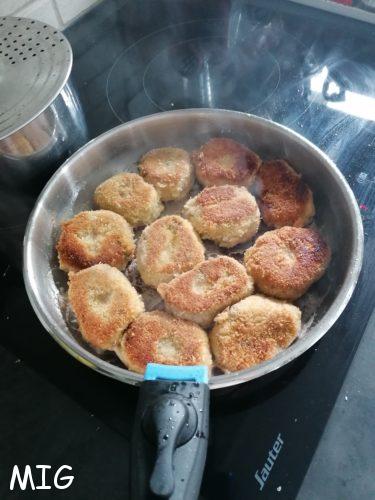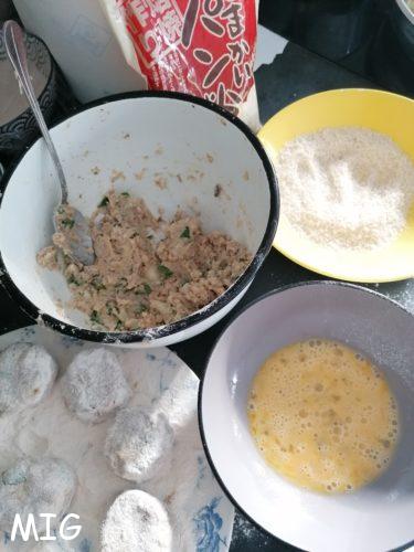Mouillez vos mains à l’eau froide, cela empêchera la préparation de trop coller, et façonnez des croquettes, de taille et forme identiques, que vous tremperez successivement, et dans l’ordre, dans les trois ingrédients ci-dessus avant de les plongez dans une poêle pleine (façon de parler, 2 cm de haut suffisent), d’huile chaude.