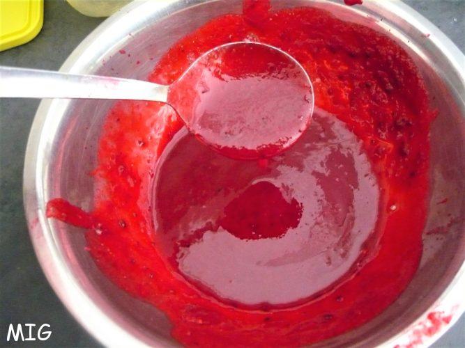 Dans un blender ou avec un mixeur plongeant, réduisez en purée le cassis avec le jus de citron, le sucre. Passez au tamis en appuyant bien pour récupérer le maximum de purée puis portez à ébullition (6/10 pour moi) et laissez mijoter environ 5 mn tout doucement (3/10).
