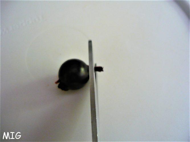 Sécher-les délicatement, séparez-les des tiges et, avec des ciseaux, coupez le petit pédoncule, comme sur la photo, mais uniquement pour 150 g de cassis. Celui qu’on va utiliser pour la compotée sera tamisé donc les pédoncules et peaux resteront dans le tamis.
