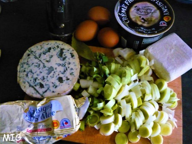 Mélangez les oeufs, la crème, la fourme d’Ambert en petits morceaux, poivrez. Incorporez les poireaux, goutez et rectifiez l’assaisonnement sans perdre de vue que le fromage va saler l’ensemble.