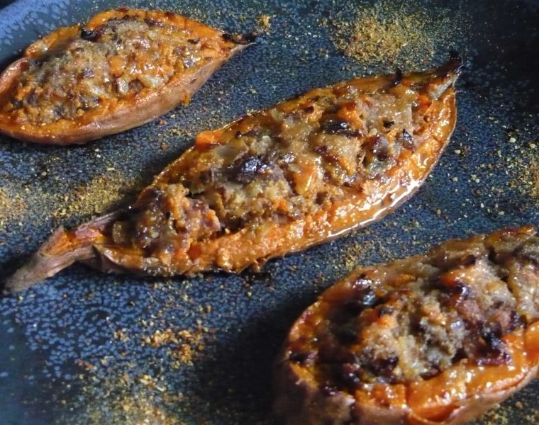 Quelques petites patates douces (petites parce que bio, les conventionnelles sont beaucoup plus « poussées » et donc plus grosses), une cuisse de confit de canard qui trainait, un oignon de Roscoff, et voilà…