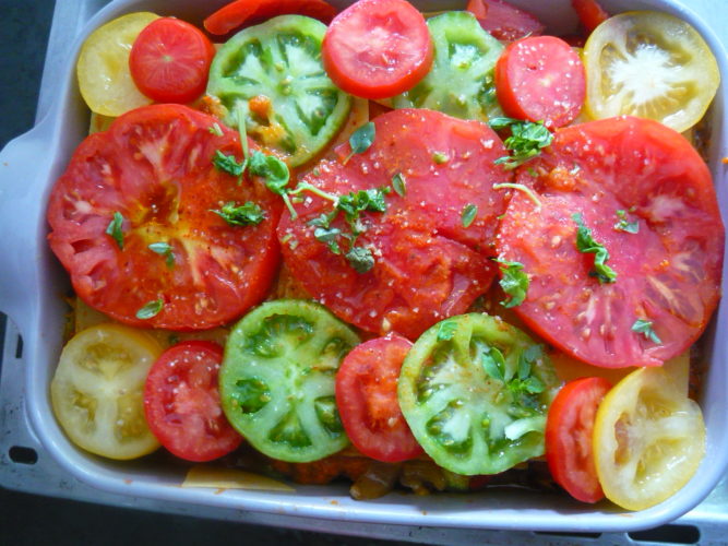 Tapissez le fond du plat d’une couche de sauce tomate, puis une couche de lasagnes, puis une couches de légumes (soit vous les mélangez, soit vous faites une couche par légume), alternez jusqu’à ce qu’il ne reste plus de légumes, en mettant toujours un peu de sauce tomate sur les plaques de lasagnes. Arrosez la dernière plaque de lasagnes du reste de sauce tomate, avant d’y disposer des rondelles de tomates fraîches.