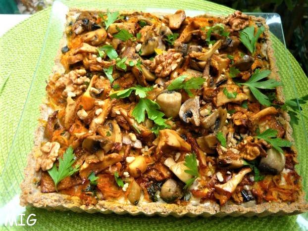 Faire revenir le reste de champignons dans de l’huile d’olive, saler, poivrer, ajouter le reste de persil ciselé, égoutter. Mettre sur la tarte à sa sortie du four, décorer avec quelques cerneaux de noix, des copeaux de mimolette.