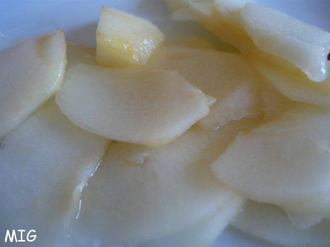 Quand la pâte est reposée, éplucher les poires et les couper en fines, très fines lamelles, transparentes. Si vous n’avez pas de mandoline, un couteau très bien aiguisé sera parfait, voire un économe.
