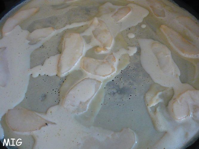 Dans la plupart des recettes « Belle Hélène » les poires sont au sirop, mais comme les deux autres incontournables de la recettes sont la glace à la vanille et le chocolat fondu, à la finale, je trouve cela trop sucré, d’où ma préférence pour des poires crues, en fines lamelles, dans la pâte.