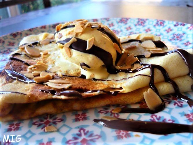 Pliez une crêpe par assiette, y déposer une jolie quenelle de glace vanille, faire des zigzags de chocolat avec une cuillère et parsemez d’amandes effilées.