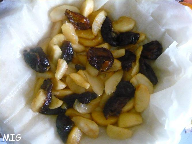 Avec un pinceau, badigeonnez de ce jus tout le fond et les cotés de la tourtière ainsi que la première feuille de pâte filo avec laquelle vous en tapisserez le fond, coté beurré sur le dessus. Répéter l’opération avec 6 feuilles en les décalant à chaque fois de la précédente pour que les angles ne soient pas alignés les uns par rapport aux autres (je me demande si je suis claire là…bon sinon explications contre enveloppe timbrée pour la réponse…). Ca fait un genre de nid en pâte filo avec plein de volants autour (si vous aimez la couture vous suivez, les autres essayez de visualiser le truc) sur lequel vous répartissez pommes et pruneaux :