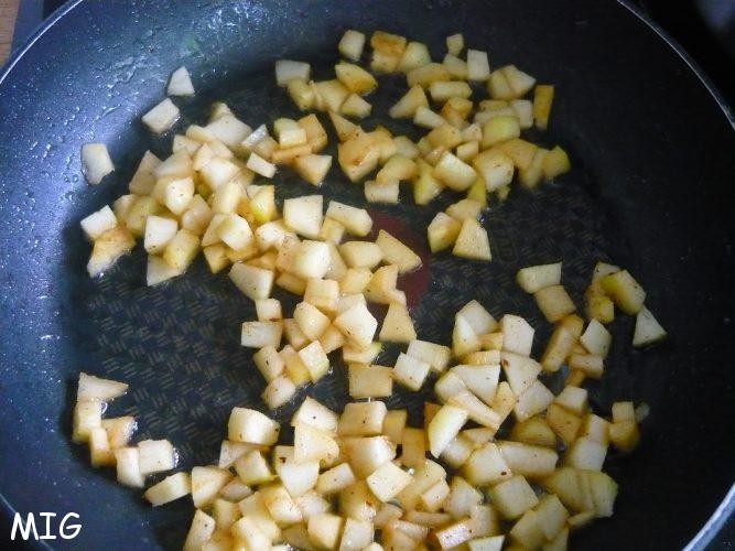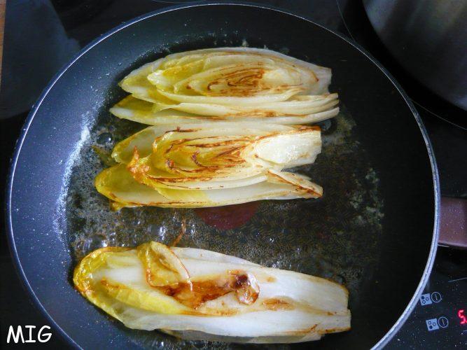 Faire fondre le beurre dans une poèle, y saisir les deux moitiés d’endives sur la face coupée pour commencer, puis sur l’autre (elle doit rester légèrement croquante), débarrasser en gardant le beurre dans la poèle, y saisir rapidement les dés de pomme.