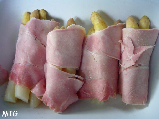 Selon la taille des asperges, en prendre trois ou quatre, les rouler dans une tranche ou une demi tranche de jambon (l’idée étant de faire huit roulés) et les placer dans un plat à gratin.