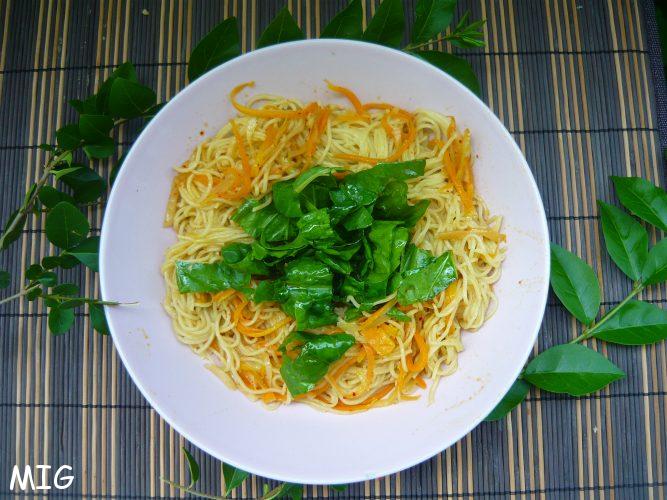 Dans chaque assiette, faire un nid avec les nouilles aux légumes, déposer au centre une poignée d’épinards assaisonnés, saupoudrer d’une bonne pincée de ciboulette ciselée.