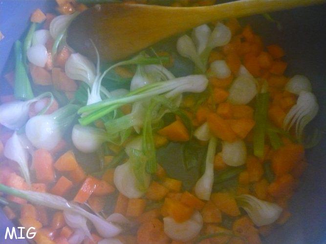 Eplucher les carottes et les oignons, tailler les carottes en tout petits morceaux, couper les oignons, avec les tiges, en quatre. Faire chauffer suffisamment d’huile dans une sauteuse pour que le fond soit recouvert, et y faire suer les carottes et les oignons, en remuant régulièrement, pour éviter qu’ils brûlent.